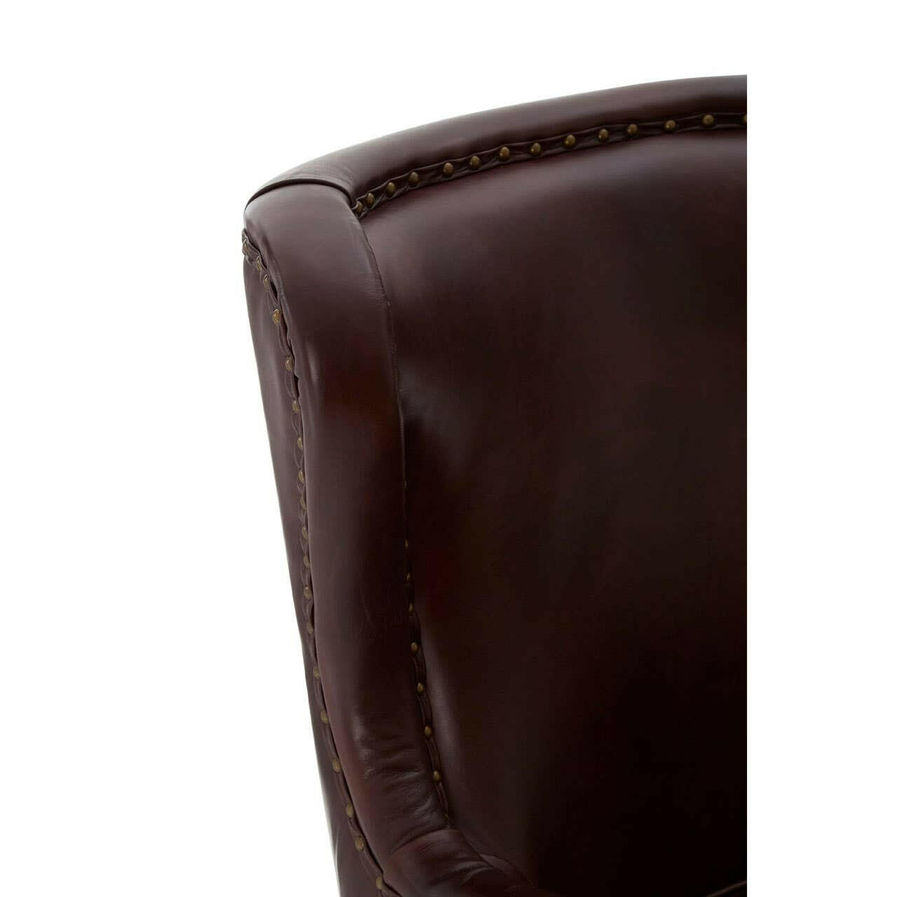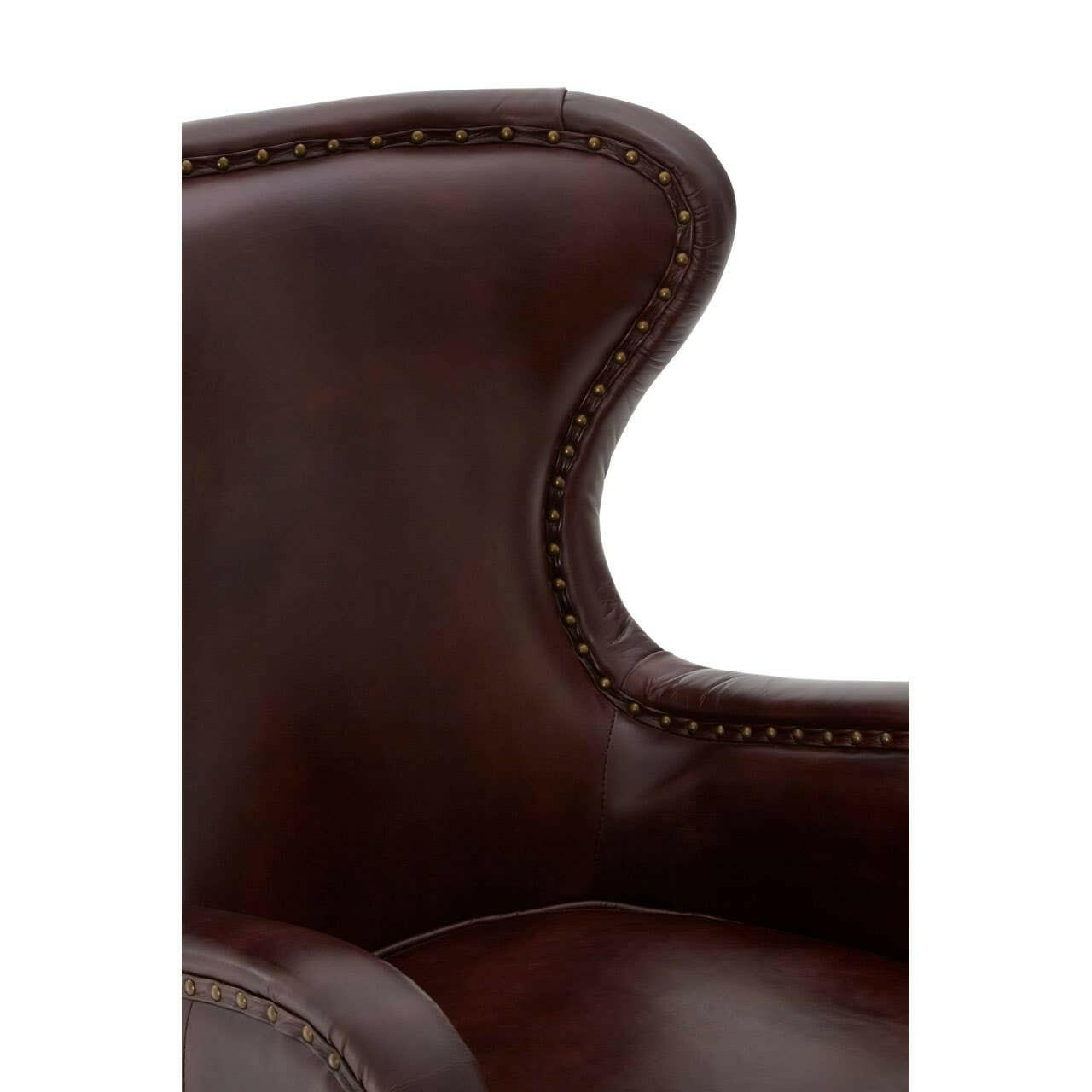 The Victor armchair is upholstered in soft coffee coloured leather. Copper coloured studs trace its heritage-inspired design lines. The feet are carved from solid walnut wood with a black finish that complements the leather.