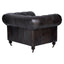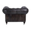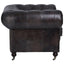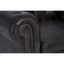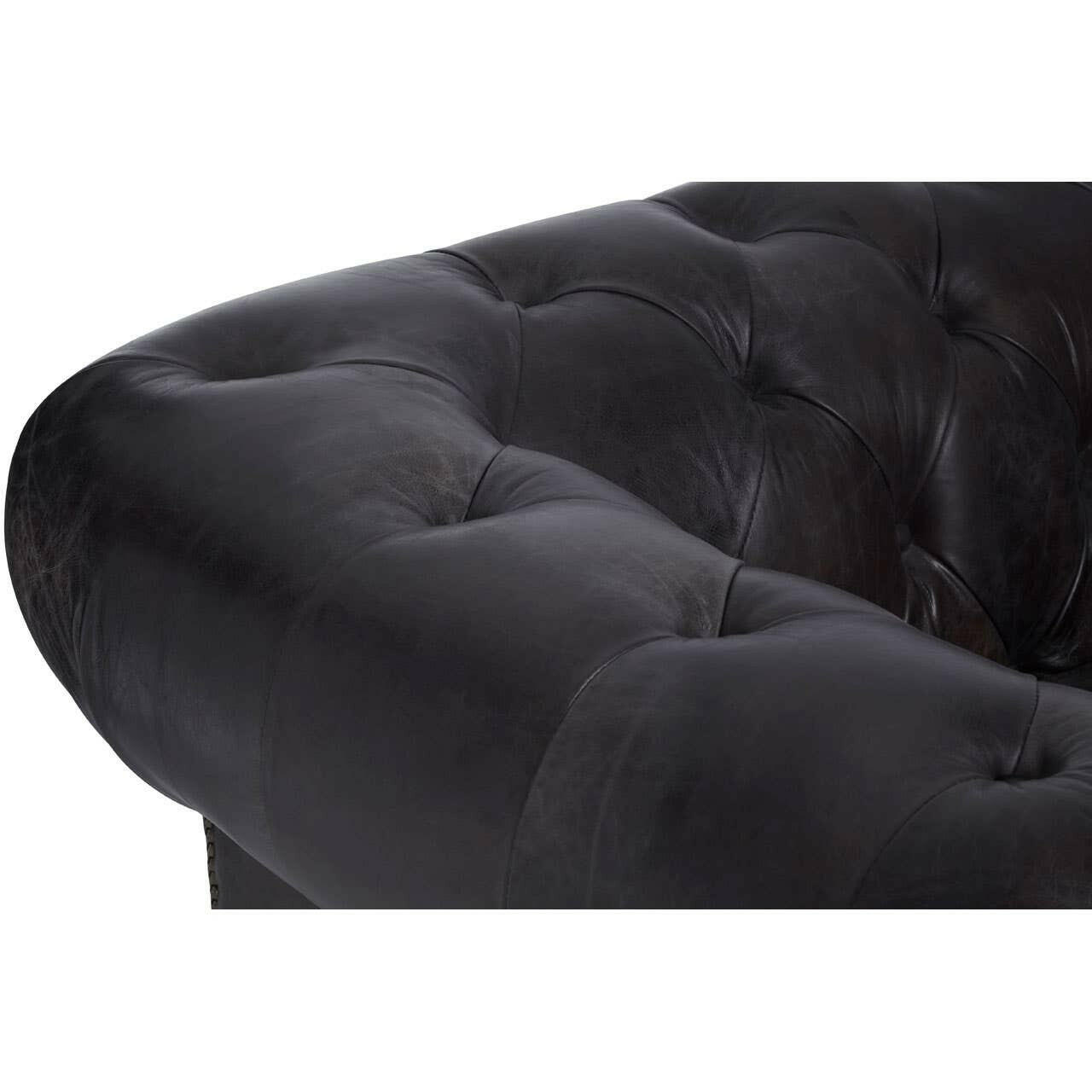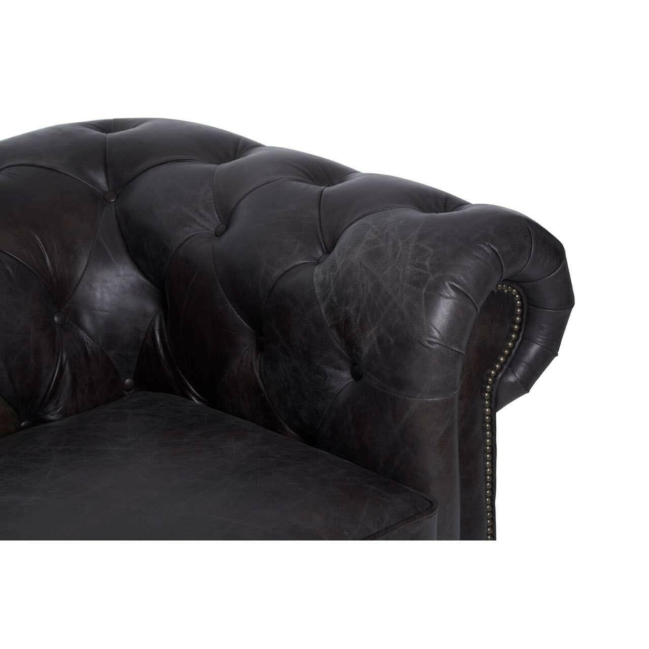 Metallic studs trace the lines of the large rolled armrests, and the traditional Chesterfield style is accentuated by the button tufted backrest. Its carved feet are crafted from solid walnut wood, and each one features a small caster wheel.