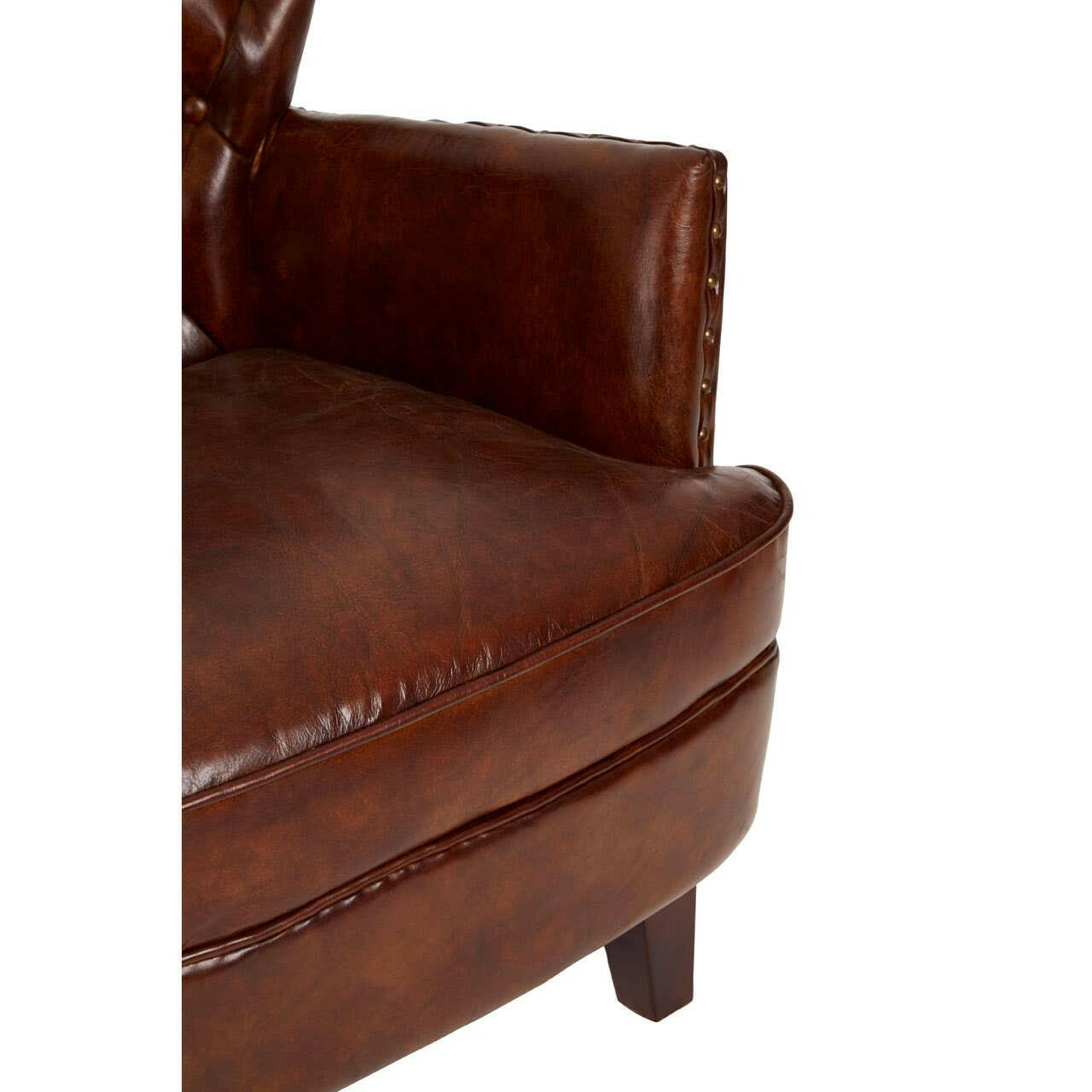Its quilted backrest takes inspiration from traditional Chesterfield design. The rich mocha brown coloured leather adds to its appeal. Metallic studs adorn the armrests, and its feet are crafted from solid walnut wood.