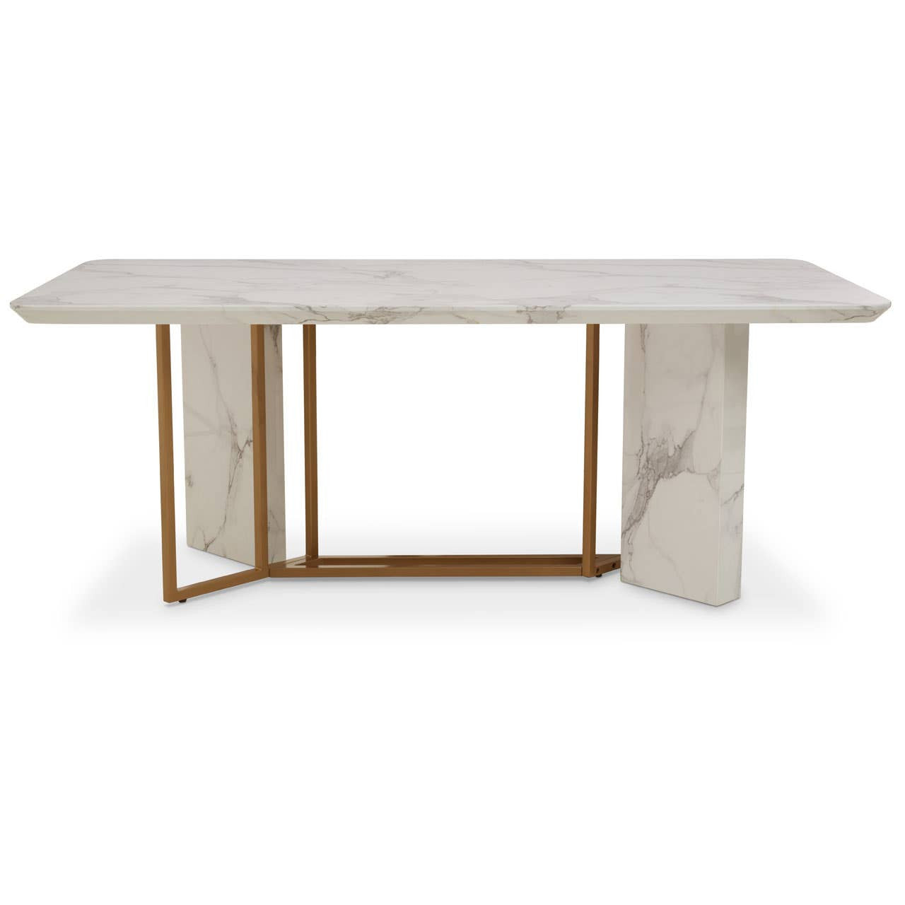 This Vieste dining table has rectangular white mable top and supported by gold polished base and marble pieces. The sleek design of this table contributes to the minimalistic charm of mid-century design.