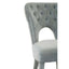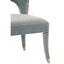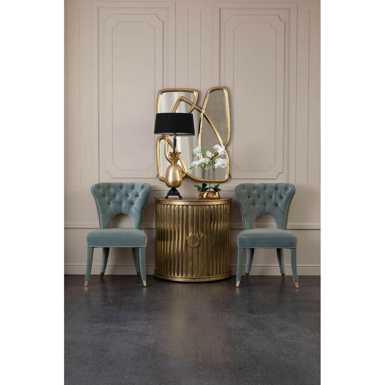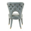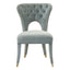 Deep button tufting decorates the front and back of its arcing backrest. The backrest sweeps down to meet a thick padded seat, with gold finish metal tipping the feet of its curving legs. The frame is crafted from natural mahogany wood, and is upholstered with soft velvet from the top of its backrest to its legs.