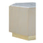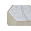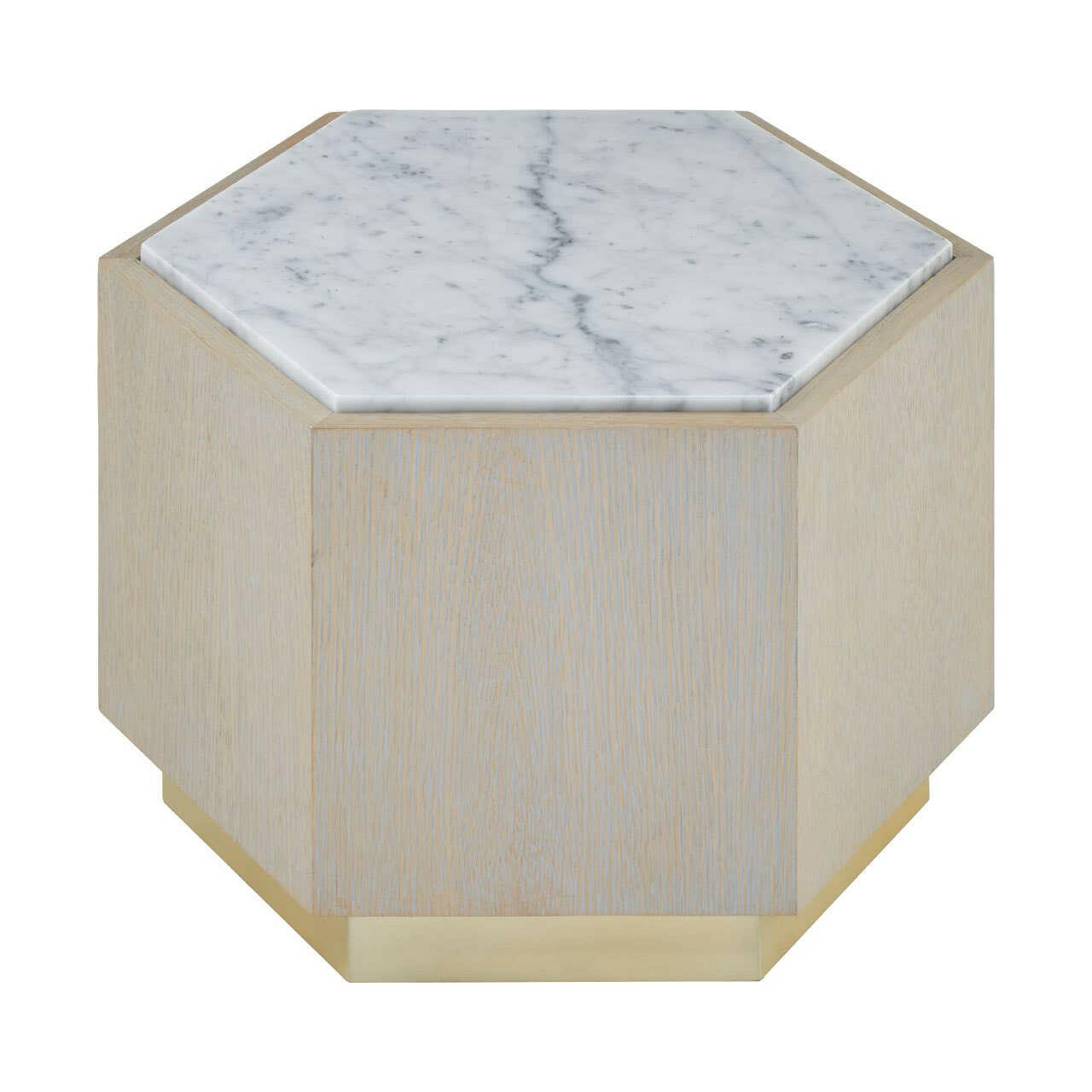 Its oak body is formed into a hexagonal shape and is given a white stain to complement the metallic coloured base. The oak's prominent grain offers a textural balance to the richly veined marble top. The marble is white and grey and provides a tactile finish to this luxe style accent table. Display it beside a sofa or armchair in the living room.