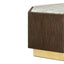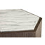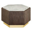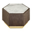 Its oak body is formed into a hexagonal shape and is given a dark stain to complement the metallic coloured base. The oak's prominent grain offers a textural balance to the richly veined marble top. The marble is white and grey and provides a tactile finish to this luxe style accent table. Display it beside a sofa or armchair in the living room.