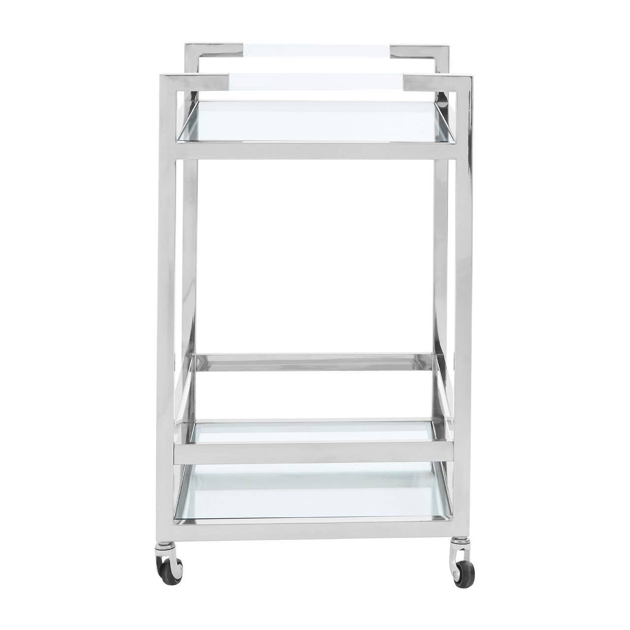 The frame of the Vogue trolley is made from polished stainless steel, with a bar surrounding its bottom section to ensure bottles stay in place when the trolley is being pushed. Both of its tiers are made from a single pane of clear tempered glass. A segment of clear acrylic is integrated into the trolley's handles.