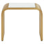 The Vogue slatted end table has a strong art deco influence, with soft lines and strong materials. The slatted matte gold stainless steel sides have a rounded edge when joining the clear glass top, creating a streamlined design.