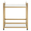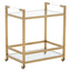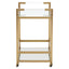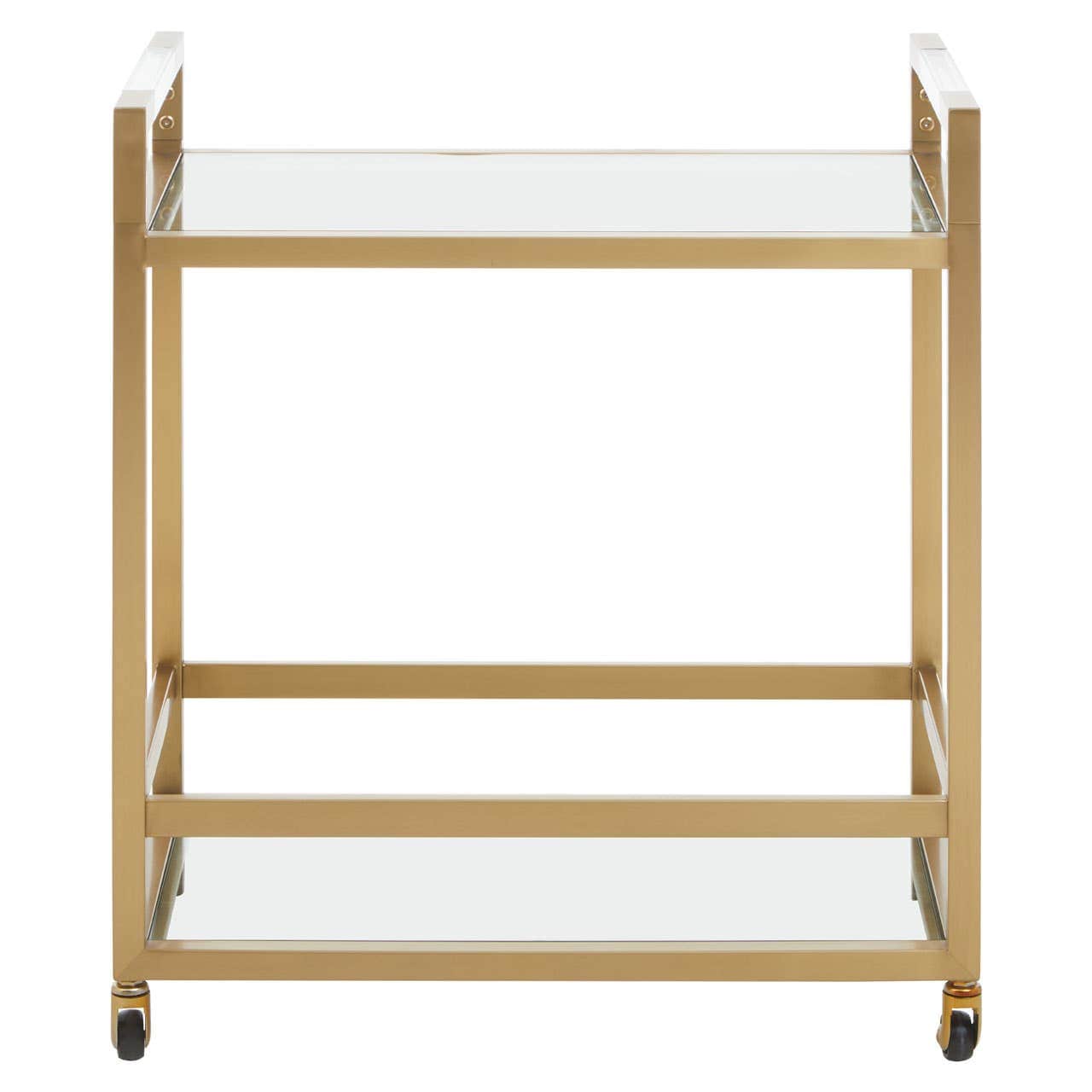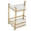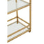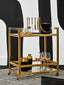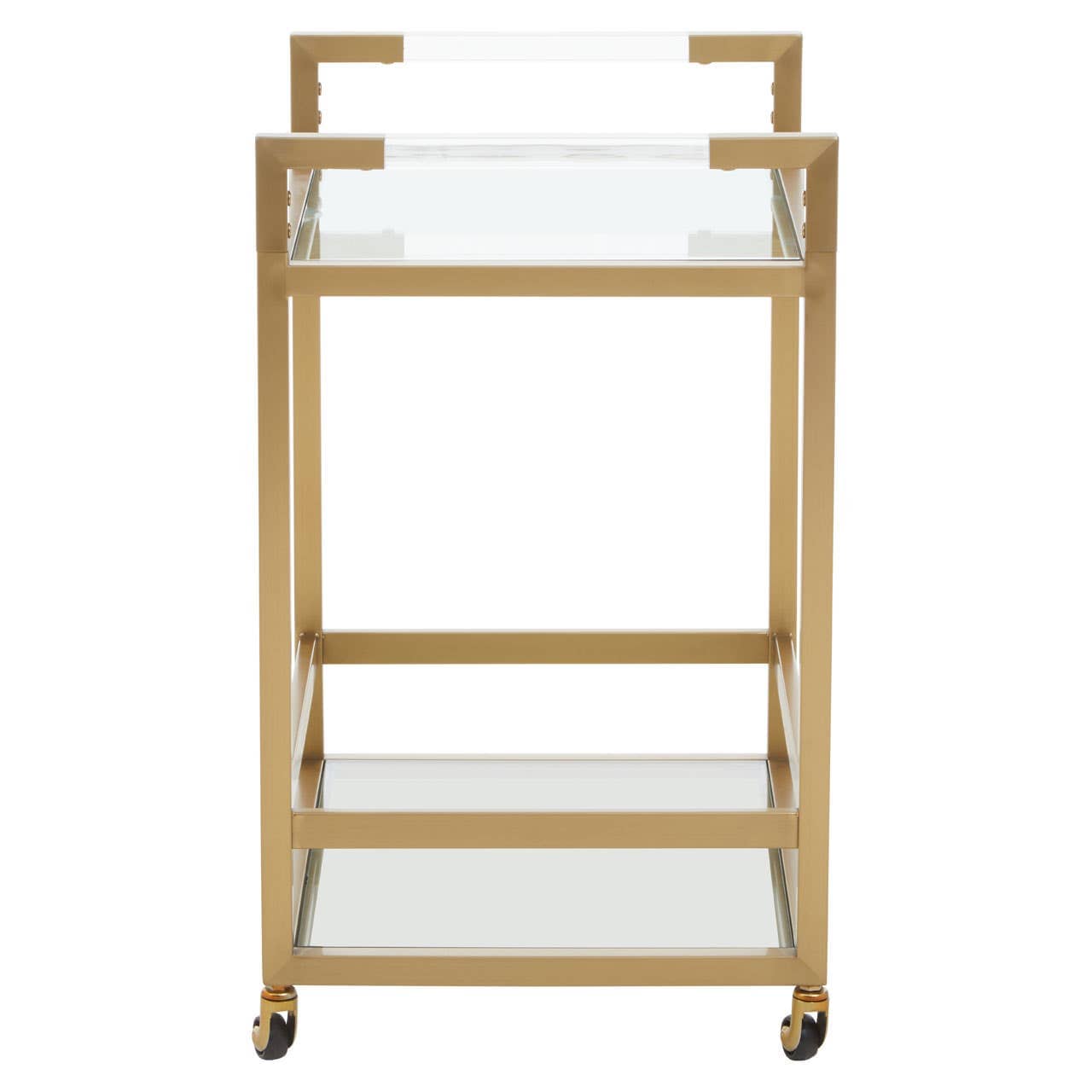 The Vogue butler trolley has a strong art deco influence, with bold geometrical features balanced by a harmony between materials. The matte gold stainless steel frame defeatures two acrylic handles, creating harmony between the frame and the glass top and open shelf.
