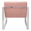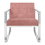 The chair's frame is made from polished stainless steel and has a simple square design that provides a platform for the pastel pink seat. The wide seat is upholstered with luxurious velvet and has a tufted grid finish. The frame is angled at the base which allows the seat to attain a slightly reclined position.