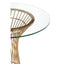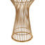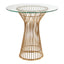 This dining table features a sleek wireframe crafted from slender, smooth metal strands in a warm gold hue. These tubular forms elegantly flare out to support the clear tempered glass tabletop, adding to the table's contemporary vibe.