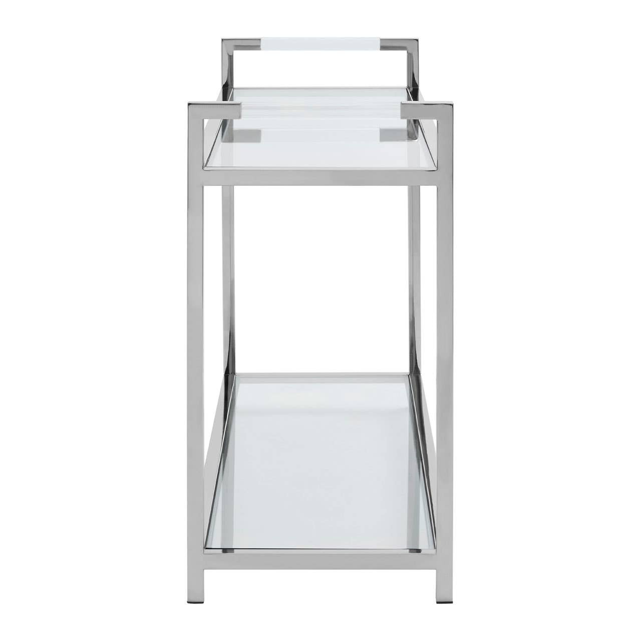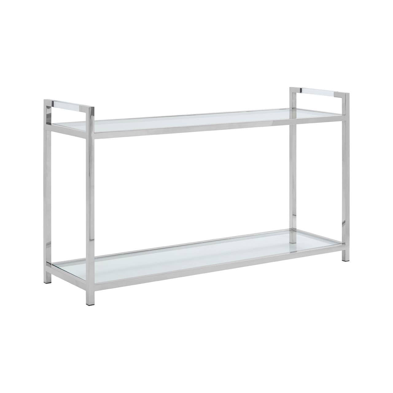 The table's frame is made from polished stainless steel and features square edging and straight, minimal lines. Its two display tiers are made from tempered glass and are set into the frame for a flush finish. The clear glass and polished steel contribute to the table's reflective aesthetic, complemented by the clear strips of acrylic that bridge its upper sides.