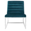 The wide seat is upholstered with plush teal velvet and features vertical channel tufting that adds to its textured appeal. Its armless design and reclined orientation both contribute to its relaxed aesthetic. The seat is mounted on a frame made from stainless steel with a polished finish that counterpoints the teal.