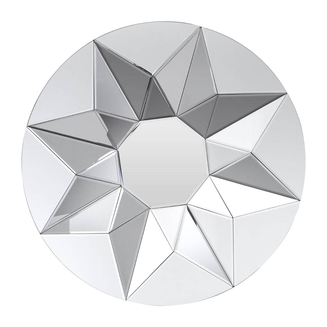 This round mirror makes a great accent piece for Boutique furnishings. Backed by strong MDF, the geometrically-formed frame consists of a series of mirrored triangular shapes. These angular forms ripple around an octagonal centre mirror.
