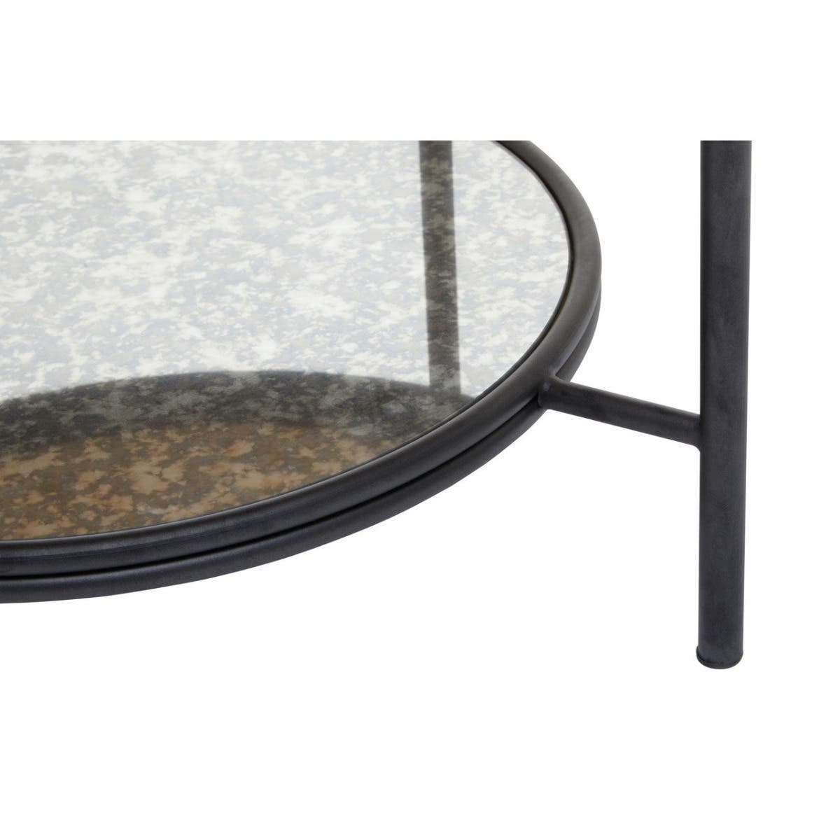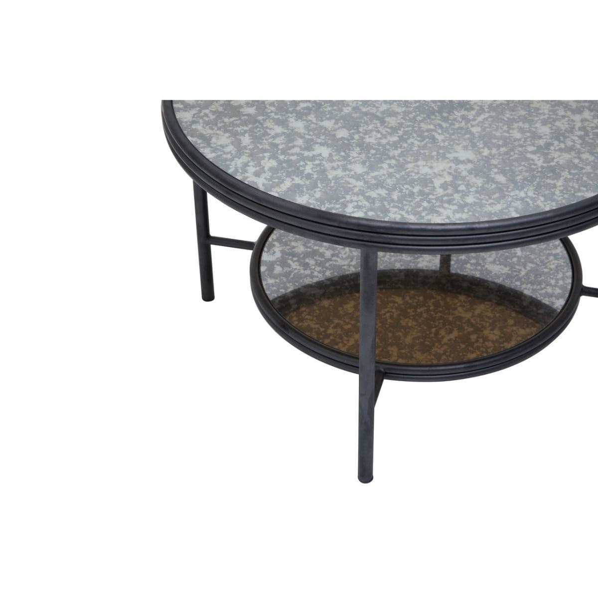 This coffee table has a round table top made from antique mirrored glass, with a matching lower shelf for open storage. The two tier design in a rustic effect forms a bold contrast with the minimal metal frame in black and silver finish.