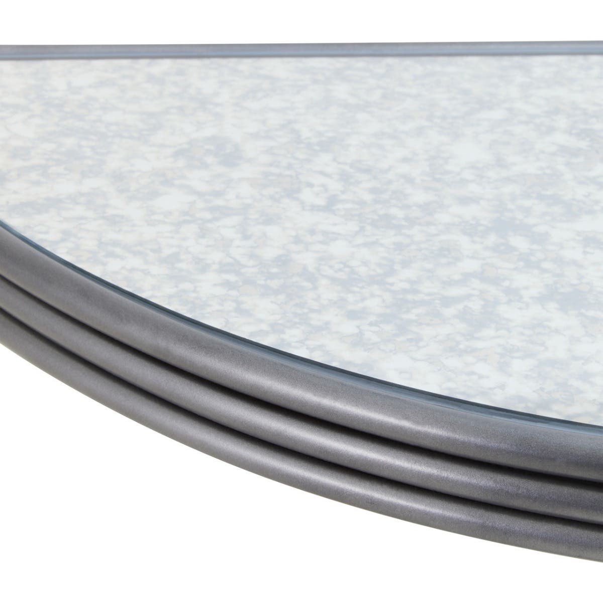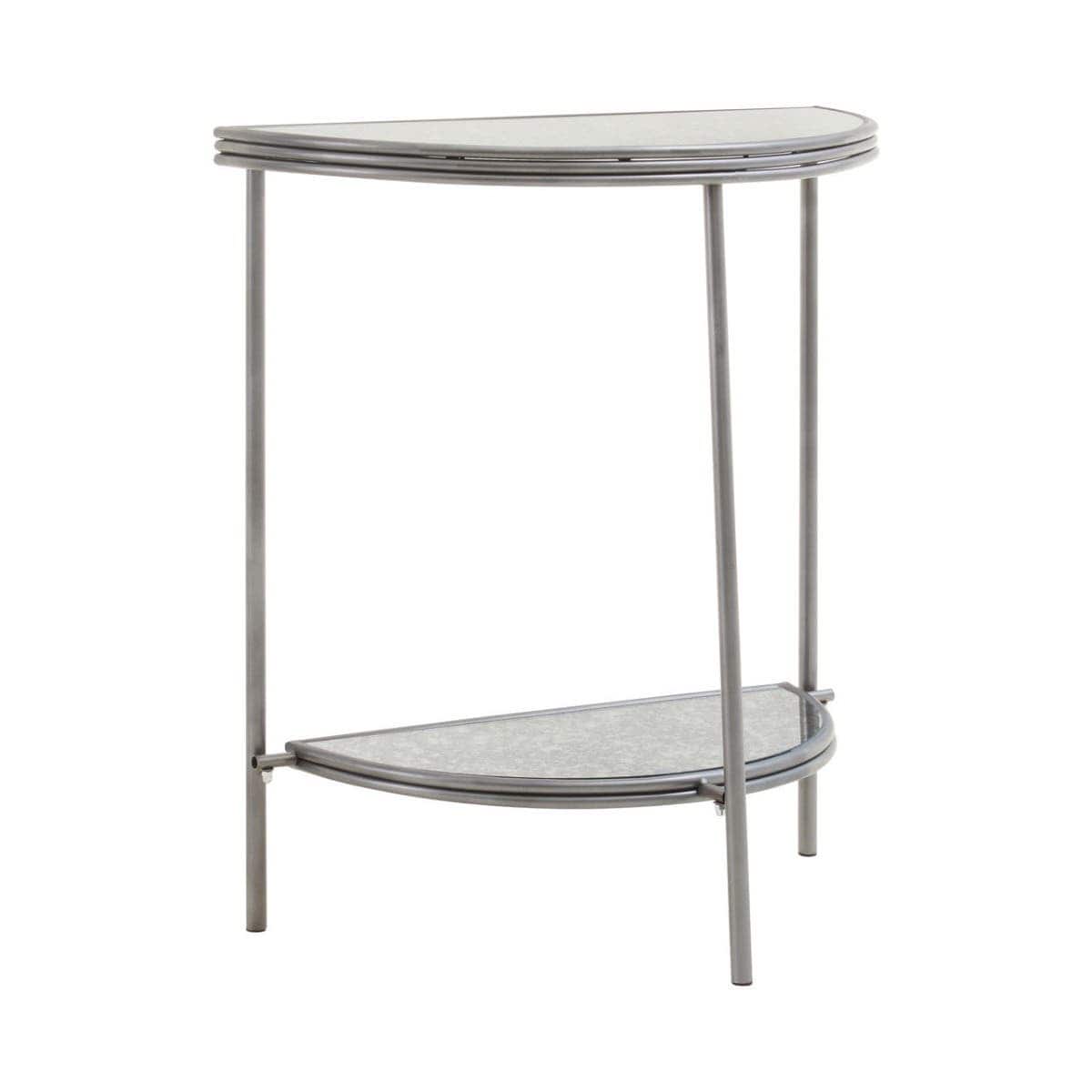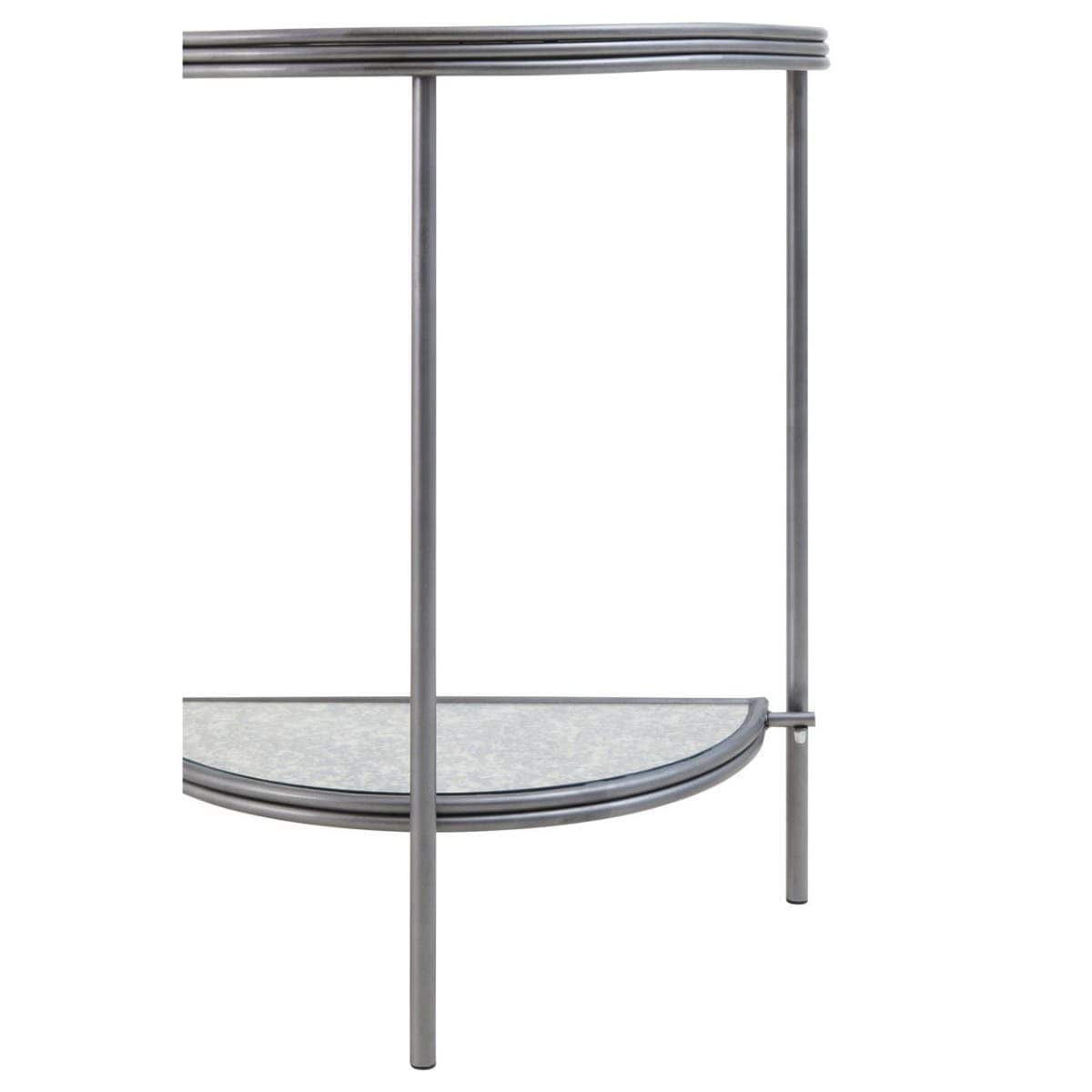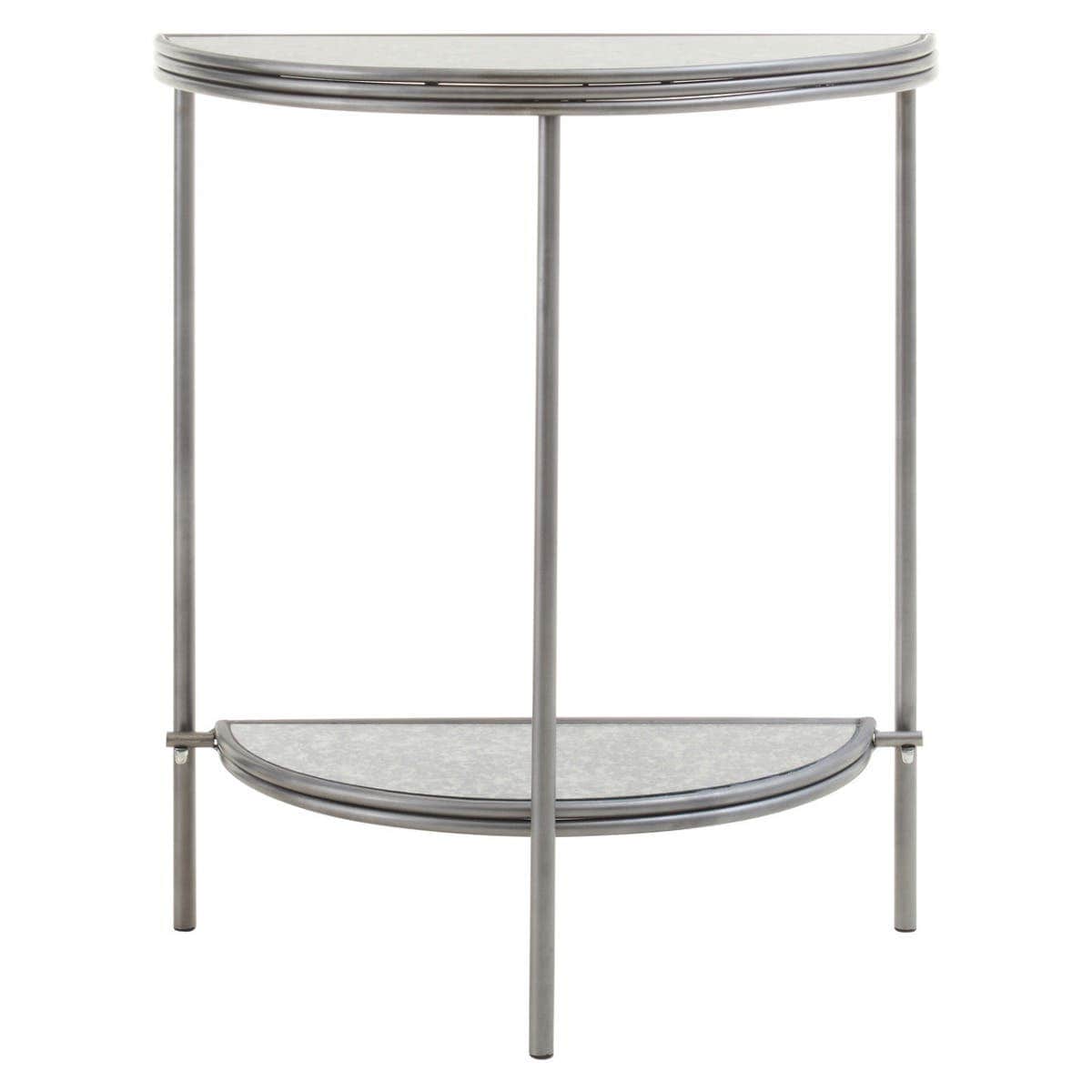 This console table with a semi-circle profile will look elegant against the hallway or entryway wall. The antique mirrored top sits above the black metal frame complete with a matching lower shelf for open storage.