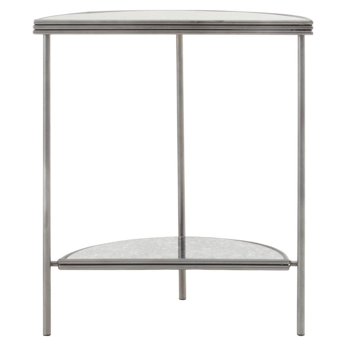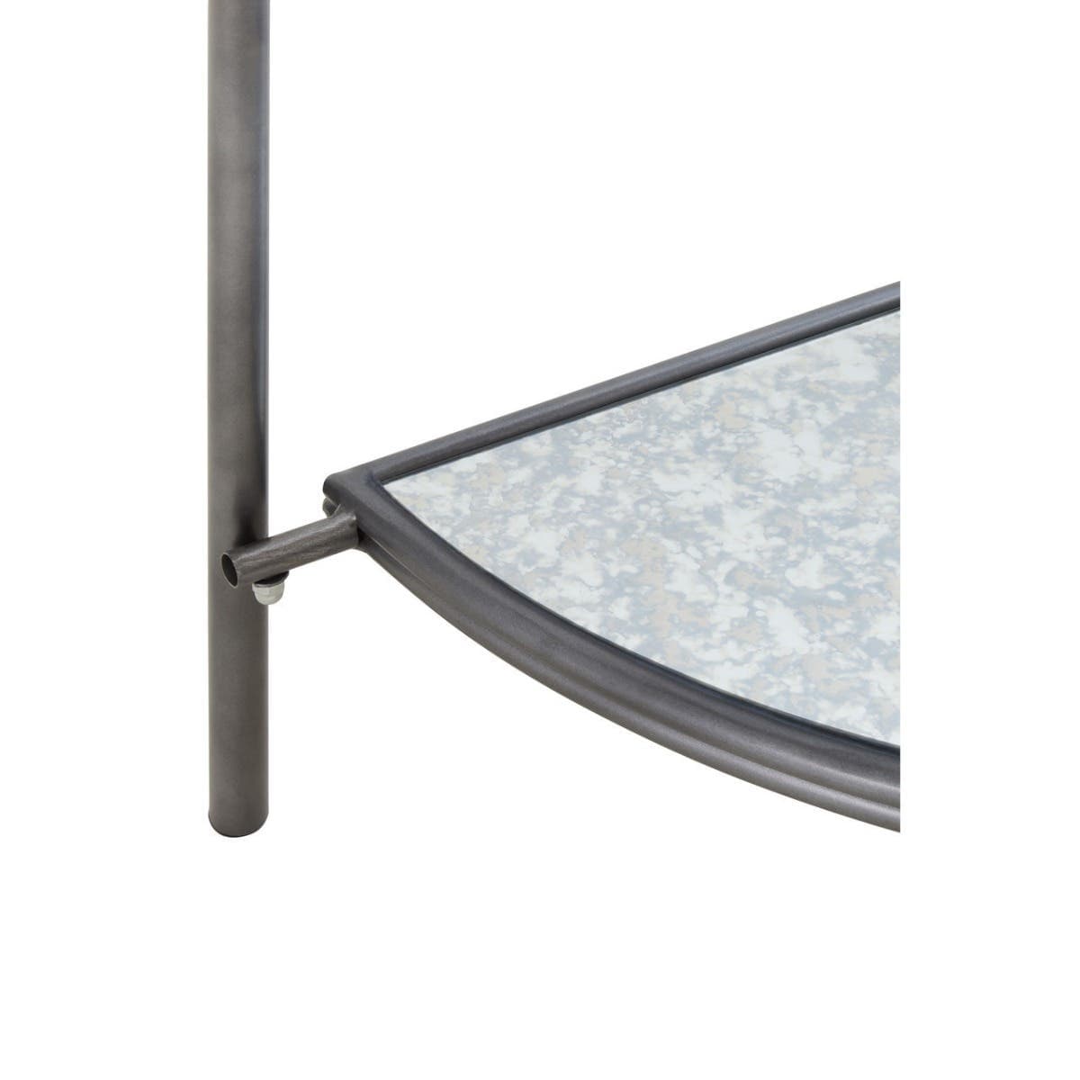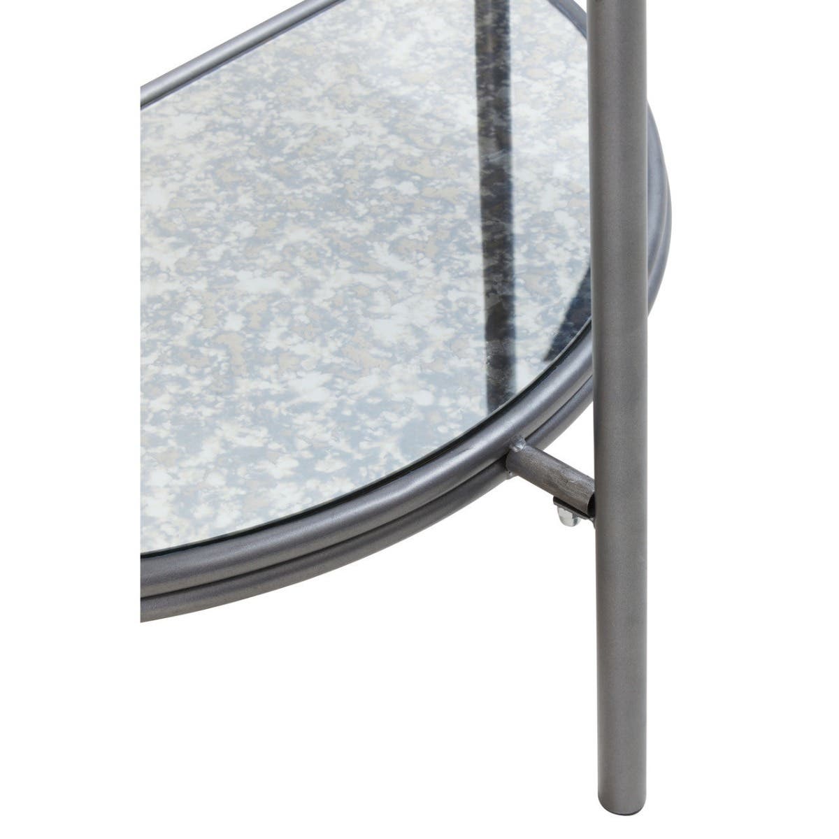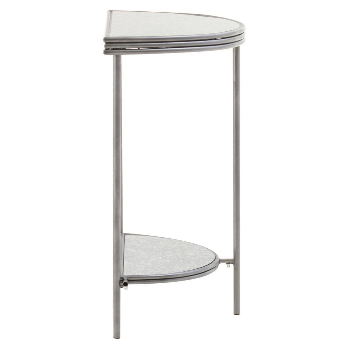 This console table with a semi-circle profile will look elegant against the hallway or entryway wall. The antique mirrored top sits above the black metal frame complete with a matching lower shelf for open storage.