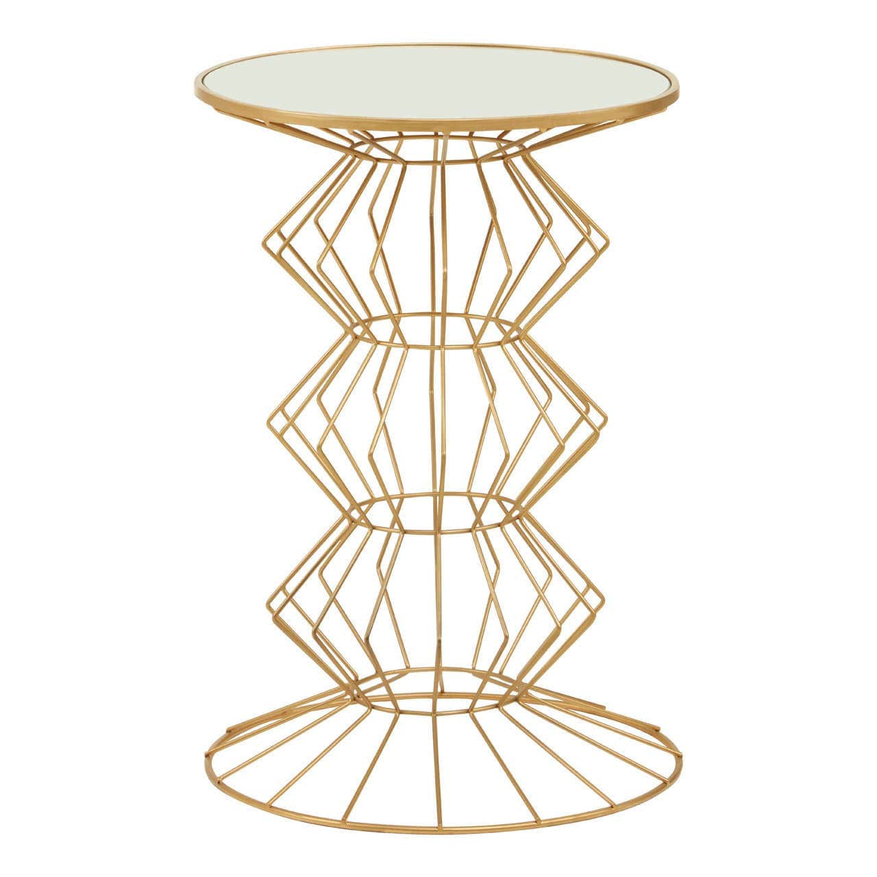 The Yaxi side table adds luxe design style to the living room. Its architectural frame is crafted from metal , and has a concertina-esque stand with a round base and top. The metal has a rich gold finish that complements warm metallic accessories. A pane round of mirrored glass is set into the top.