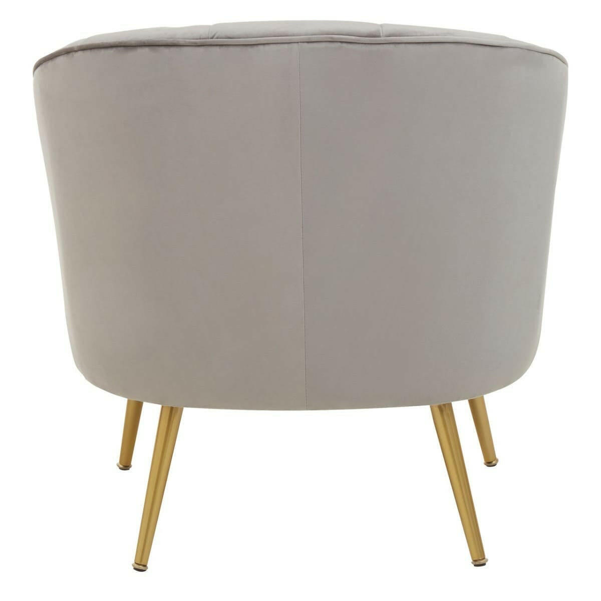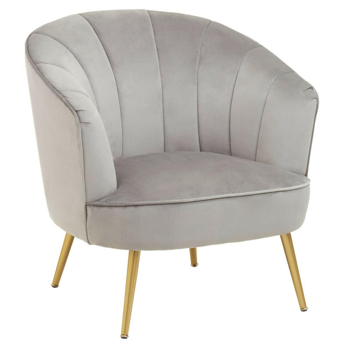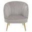 Upholstered in plush grey velvet, this chair creates an elegant aesthetic with a back in a curved silhouette and sloping armrests. The seat in generous padding rests above glistening metal legs in gold finish that updates the glam style statement.