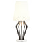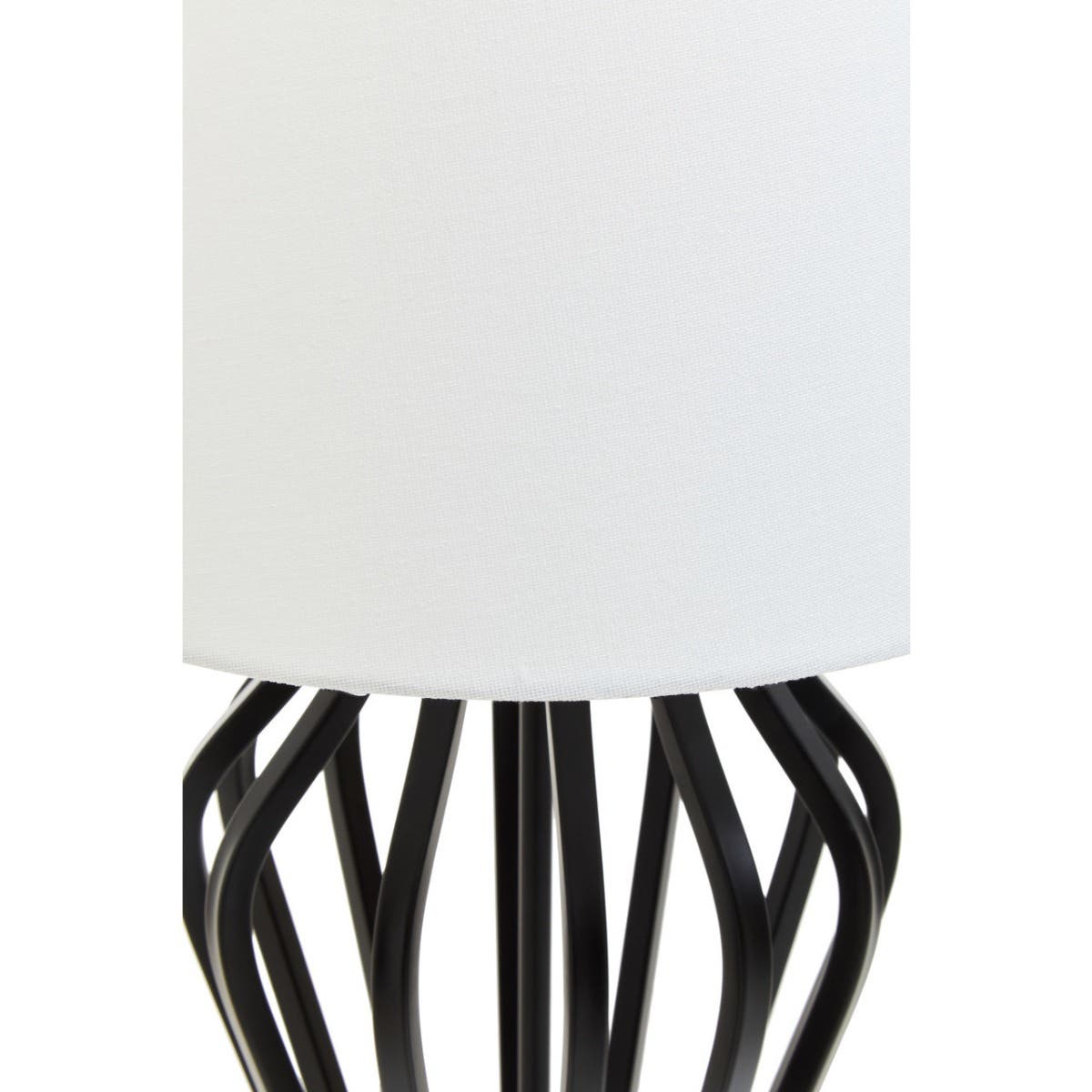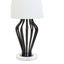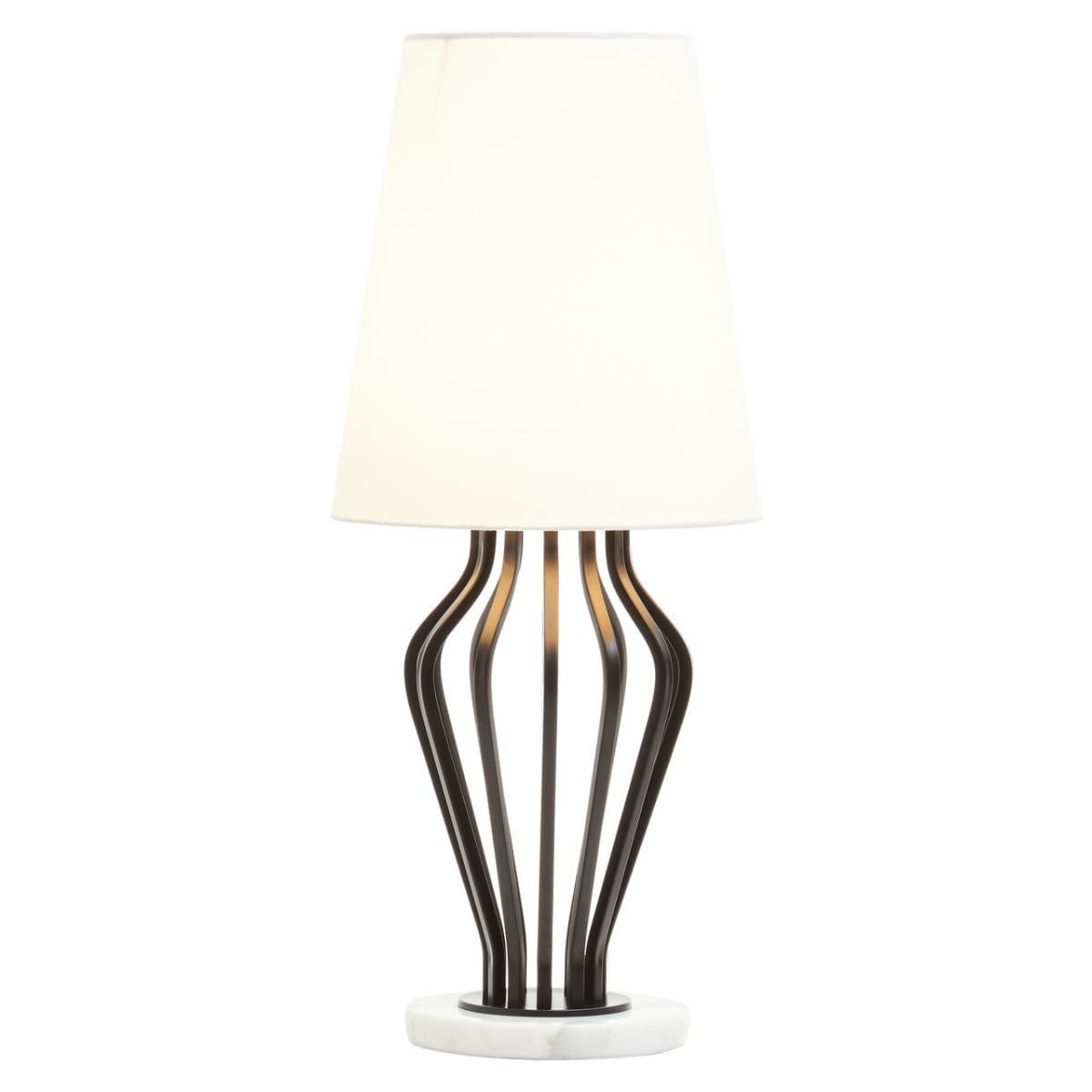 Sitting atop a round white marble base, the Zada table lamp features a tapered black iron body. The crisp white empire shade contrasts this while gently diffusing light, creating an ambient glow.