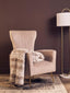 This mink velvet accent chair exudes elegance with its vertical channel tufting on the backrest and seat. The arms slope inwards, adding style and comfort. The winged backrest and slanted legs give the chair a captivating visual appeal.