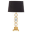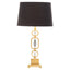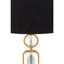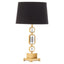 The Zana table lamp creates an art deco inspired statement. The base of the lamp is geometric and crafted from gold metal and three large crystals, which is contrasted by the crisp black linen shade.