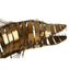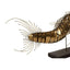 Strips of stainless steel are formed into a sinewy body that leaves a dynamic impression. The steel is coloured gold, with slim slivers of steel arranged at certain points to replicate fins and teeth. The barracuda is mounted on two slim rods set into a wooden base, the latter coloured black to contrast the gold.