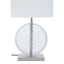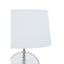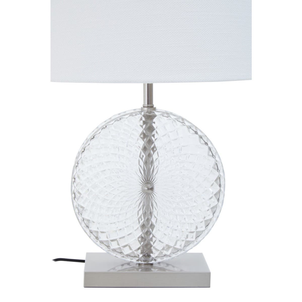 The Zarni table lamp combines vintage style glasswork with modern chrome. The base and stem are brushed chrome, with the stem of the lamp encased in a circle of round cut glass. The crisp white shade adds to the cool aesthetic of the lamp.