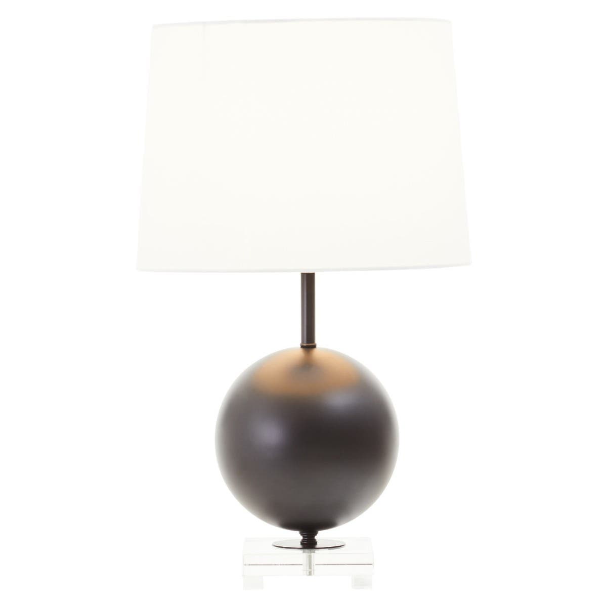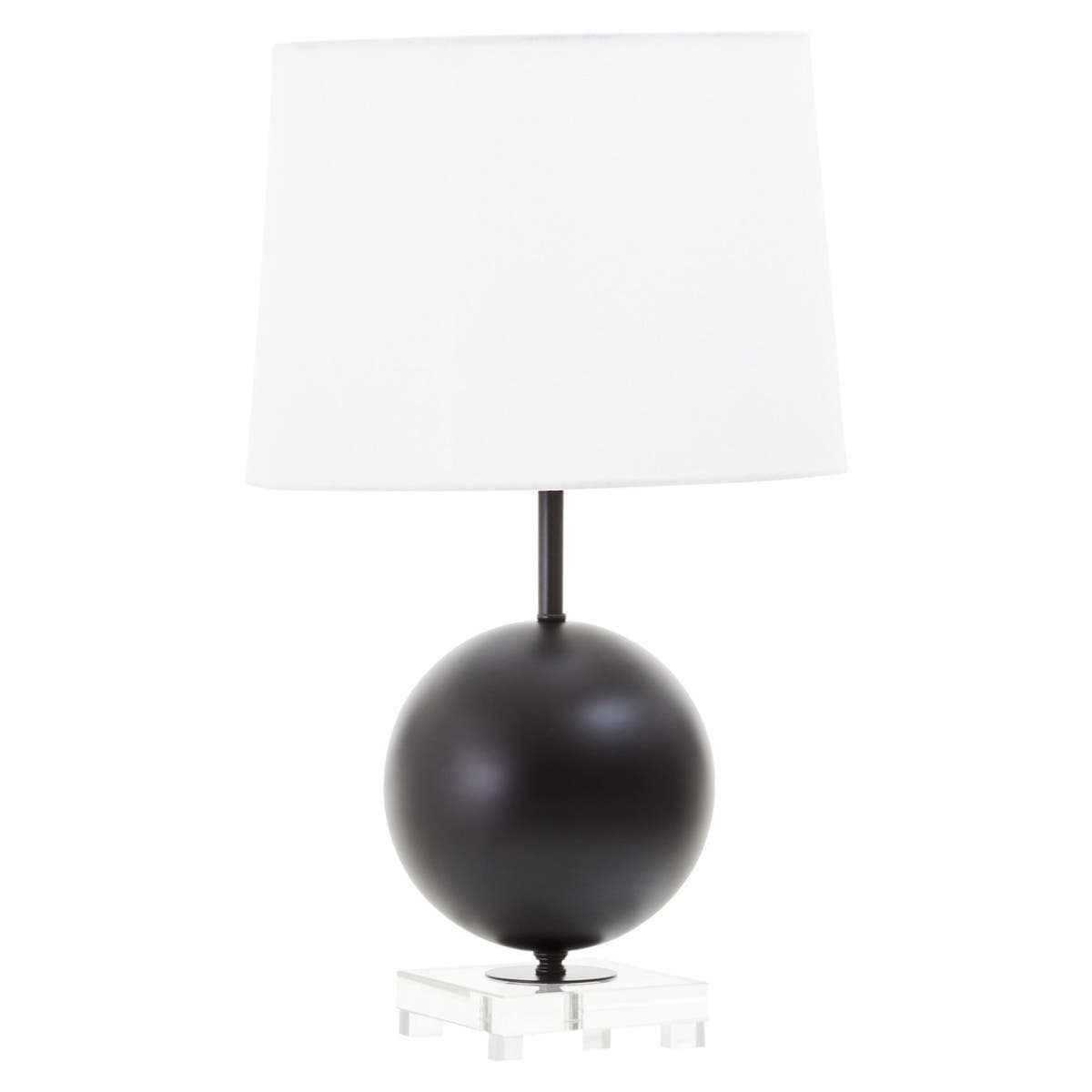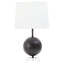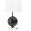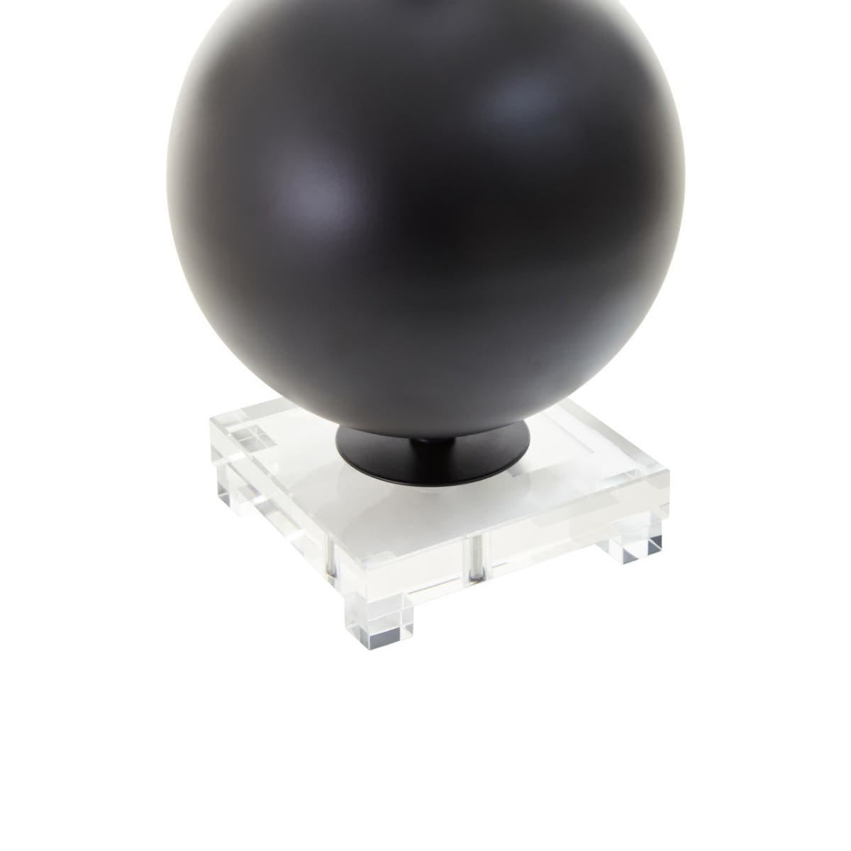 The Zena modern table lamp has a square base of clear crystal glass, the lamp then features a round body, crafted from smooth black iron. The minimal crisp white linen shade helps to diffuse light and create an ambient glow.
