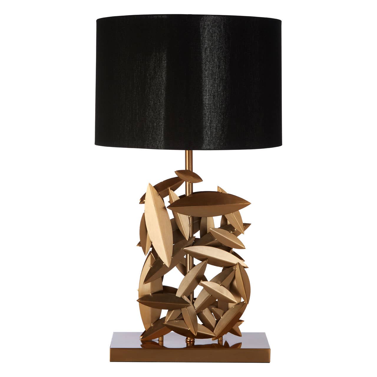 Resembling a collection of minimalistic leaves cascading to the ground, the Zilla table lamp's body is formed from smooth metal. The collection of different shaped leaf-forms are finished in a metallic gold-tone that lends them a luxe aesthetic. The elegant table lamp's drum shade is created from black linen, that contrasts with the warm metallic body to create a luxurious accent piece.