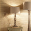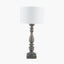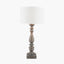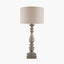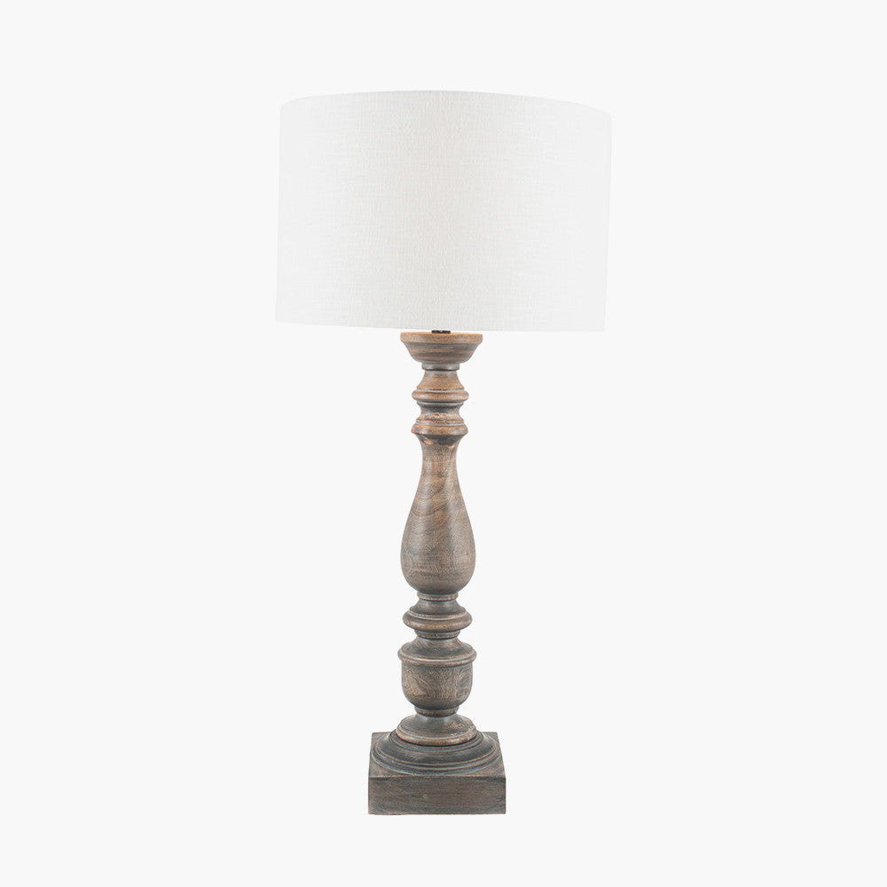 Beautiful rustic turned wood base, handcrafted in India and finished in grey wash wood. This is an elegant lighting solution with natural charm in abundance. Choose from our extensive shade range the perfect shade to finish this lamp, maybe a slubby linen effect cylinder or faux cotton shade. Also available as a matching floor lamp. Recommended lampshade size: 35cm diameter