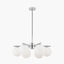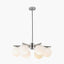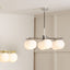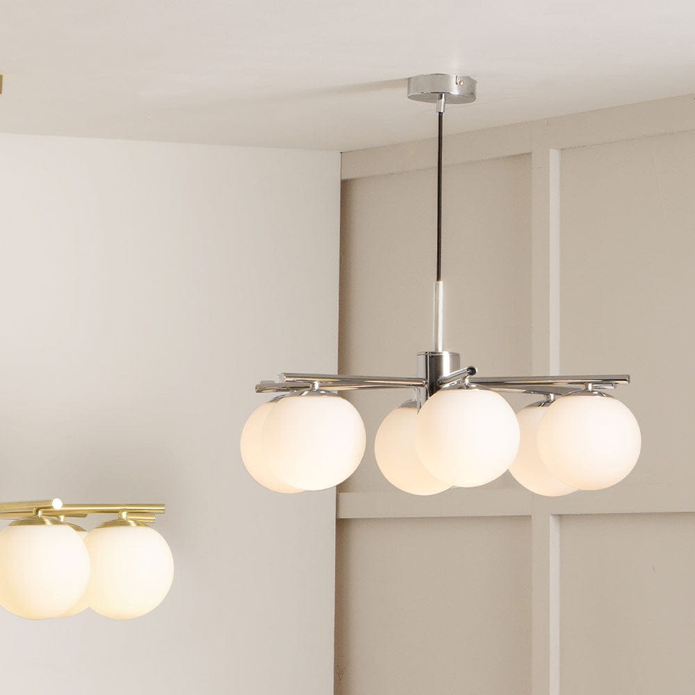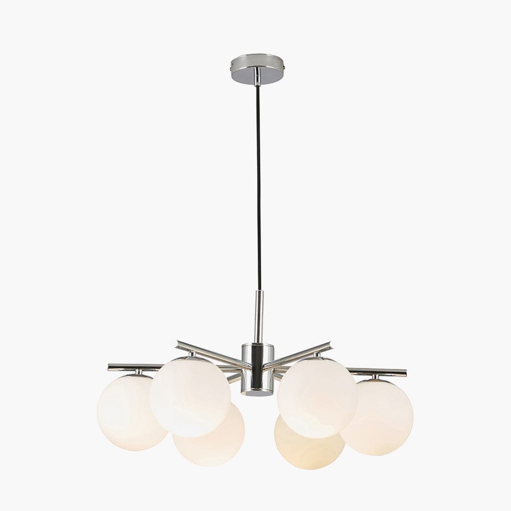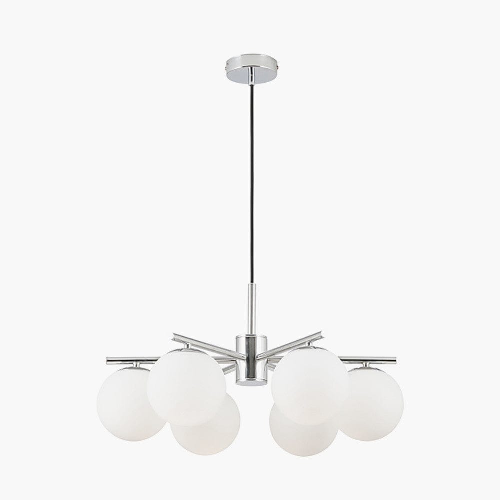 Minimal yet bold this beautiful shiny chrome metal ceiling pendant will stop you in your tracks. The stunning pendant with six white orb glass balls instantly create a striking centrepiece. Also available in a table lamp and floor lamp.