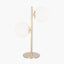 Add a contemporary touch with this beautiful table lamp. This gold metal and two white orb glass balls table lamp will create a truly stylish look in any room. Also available in a floor lamp.