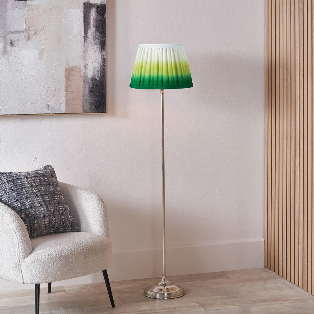 A refined and elegant candlestick floor lamp base made in India, featuring a stepped circular foot and a silver metal finish. Subtle detailing at the top of the stem lends a touch of classic charm. Its graceful proportions make it a perfect choice for living rooms, reading corners, or beside a favourite armchair. Its beautifully crafted hand-pleated tapered lampshade, featuring the striking Savoie print from Designers Guild—a signature two-toned ombre in graduating shades of green—looks fantastic, creating a contemporary feel and a welcome pop of colour.