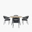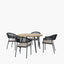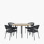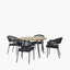 Elevate your outdoor dining experience with the Bazel 4 Seater Outdoor Dining Set. Crafted in Vietnam, the unique star design table top, in light teak effect acacia wood sits perfectly on the sleek black powder-coated metal frame. The stylish chairs, with a black powder-coated metal frame, black rope weave, and black season-proof, fire retardant cushions, ensure comfort and durability. The stackable chairs save space when not in use.
