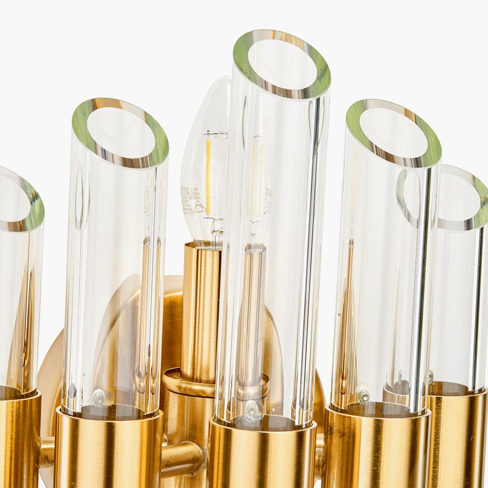 Experience the ultimate in modern luxury with our Brielle Clear Glass and Antique Brass wall light. Featuring an elegant antique brass finish and 2 beautiful lights, with stunning cylindrical clear glass tubes, this wall light is a striking statement piece that exudes sophistication. Elevate any space with this exclusive and exquisite wall light.