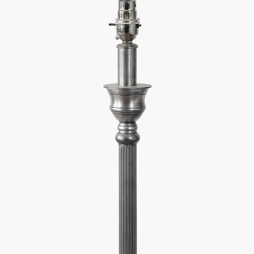 Traditionally styled, this antique silver lamp base with ribbed detail on the column, will add a hint of colonial to your look. Style with either a cylinder or a tapered shade from our range. Also available in a floor lamp Recommended lampshade size: 35cm diameter