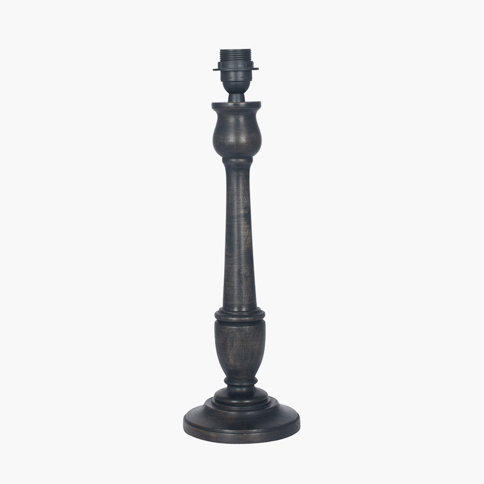 Finished in antique black this slim mango wood turned table lamp is a stylish light source solution. Allow the wood to do the talking with a plain textured shade or couple with one of our beautiful Jenny Worrall shades for maximum impact, the choice is yours. Recommended lampshade size: 25cm diameter