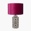 This gorgeous ceramic table lamp base most certainly commands attention with a stunning all-over Ikat design in an on-trend monochrome colour palette. The stylish table lamp base will suit multiple interior styles and looks fabulous with the velvet lamp shade in a striking raspberry hue. The lamp shade is lined with a metallic bronze gold inner to further enhance the luxury.