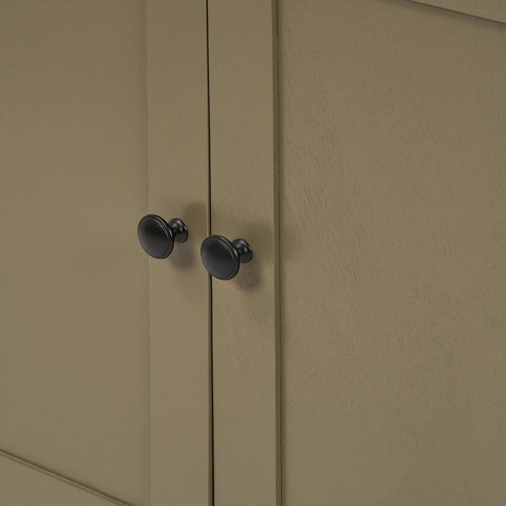 This sideboard boasts ample storage with an interior shelf and classical style. Finished in a stylish olive green colour with graphite metal hardware, this piece is the perfect addition to any dining room, hallway or lounge.