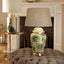 Tropical, ceramic table lamp with a palm leaf design on a satin brass base. This striking lamp comes as a base only, however can be paired with a number of our shades from our range. Take a look at our shade page for more details. Recommended lampshade size: 40cm diameter