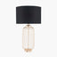 Striking geometric industrial style wire table lamp in a subtle French gold colouring. The tall metal table lamp creates a talking point within any room with its striking base and modern linen lamp shade. The self-lined linen cylinder lamp shade in black is crafted in an open weave material allowing the light to shine through, creating an ambient glow throughout your interior.