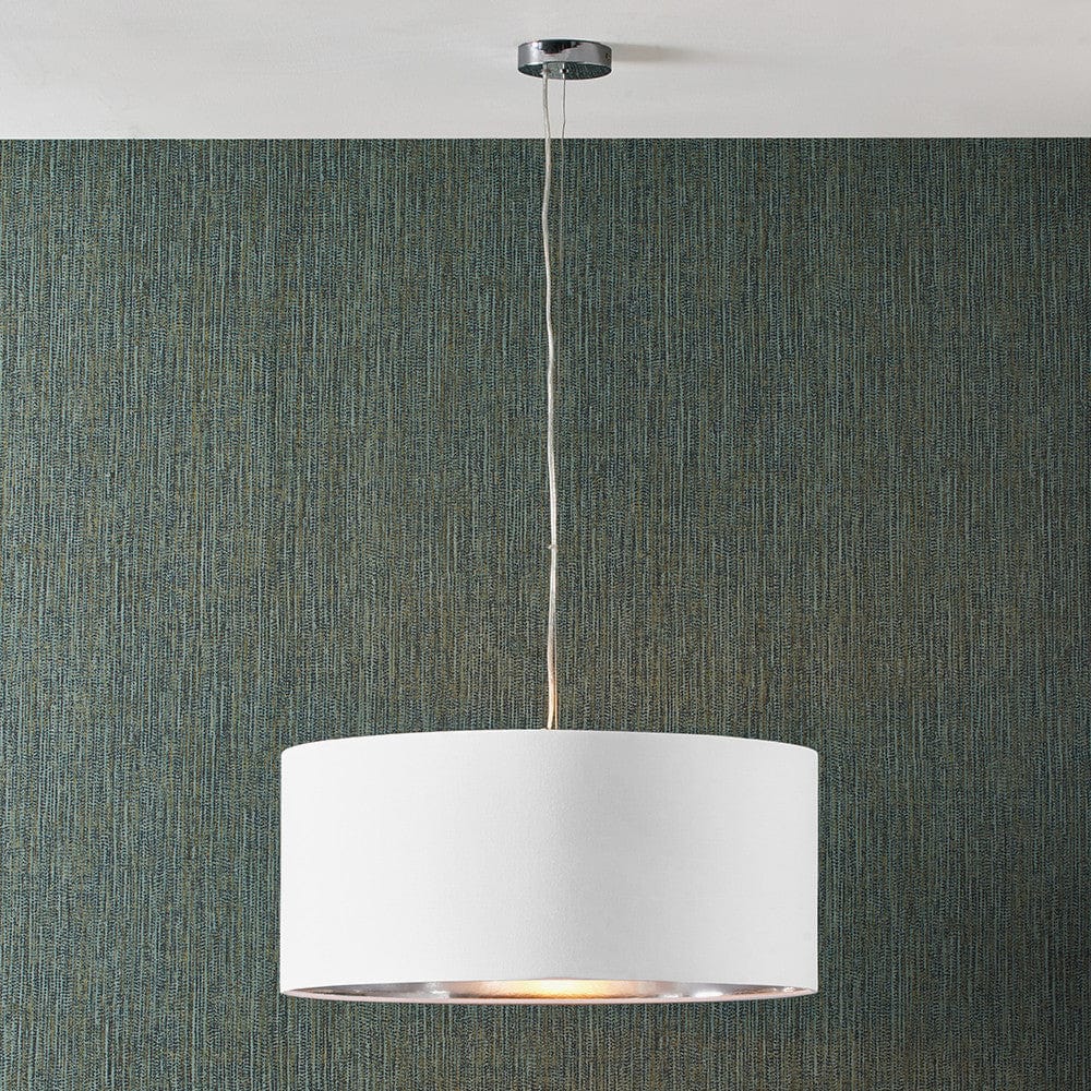 The Elin Pendant Shade is finished in a subtle ivory faux cotton and the metallic lining allows the light to shimmer when lit. The larger size adds a contemporary clean look to any ceiling.
