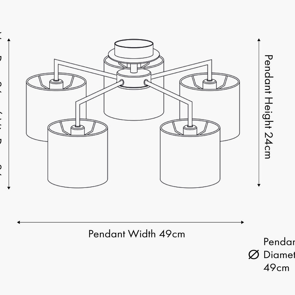 The Elin 5 Light Electrified Pendant is finished in an elegant brushed silver and complemented by 5 cotton effect steel grey shades. The metallic lining allows the light to shimmer when lit. This semi flush pendant is a sophisticated addition to any ceiling.