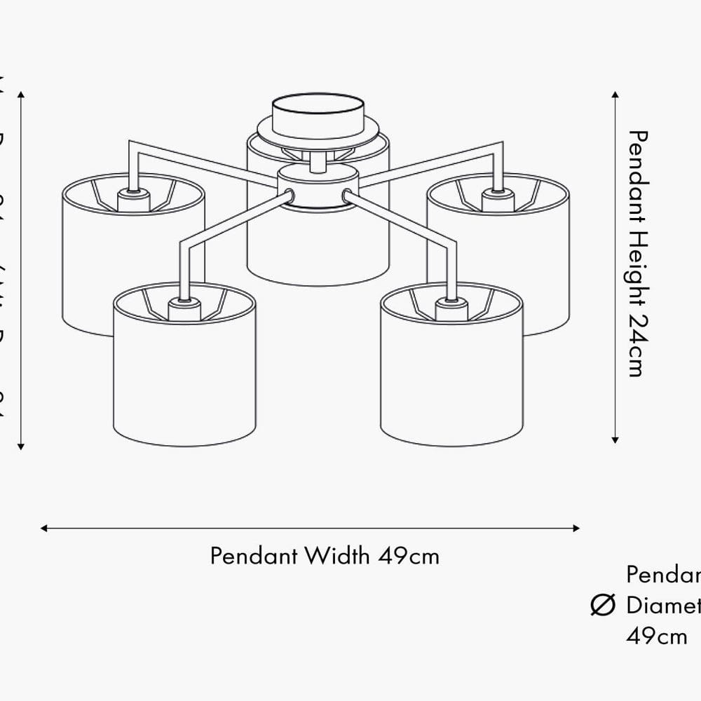 The Elin 5 Light Electrified Pendant is finished in a striking matt black and complemented by 5 cotton effect ivory shades. The metallic lining allows the light to shimmer when lit. This semi flush pendant is a sophisticated addition to any ceiling.