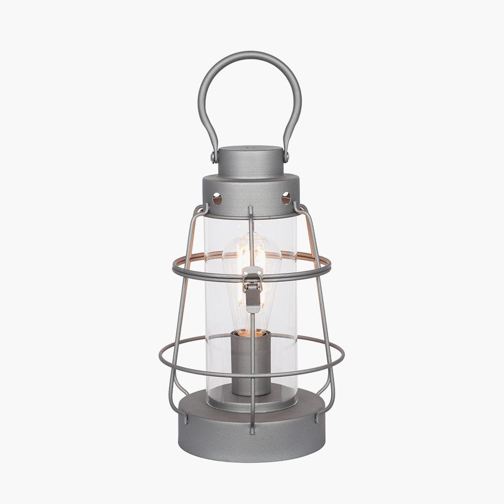 Add an element of industrial coastal styling to your home with this oil lantern effect table lamp. Finished in clear glass with matt grey metalwork, this lamp will be the focal point of any table. Also available in black metal.