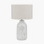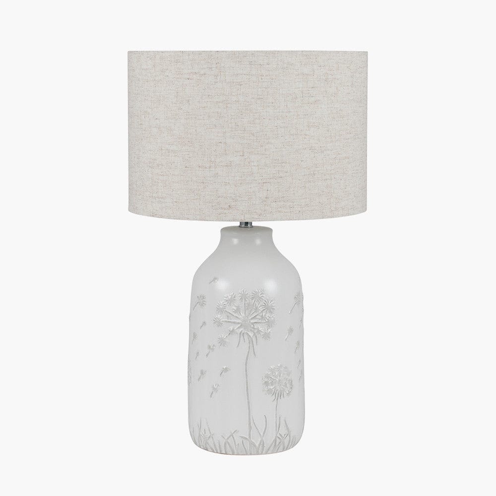 A ceramic lamp base moulded with elegant floral detailing. This beautiful base uses a contrasting natural grey colour to pick out the design. This piece comes complete with a slubby cotton, off white shade.