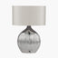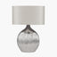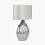A perfect console table lamp finished in textured metallic silver ceramic complete with a champagne coloured faux silk oval shade. Also available in gold.