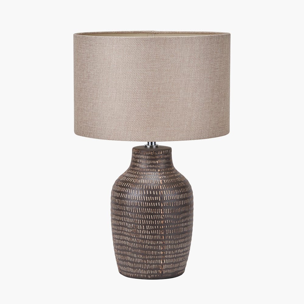 Our Kai ceramic table lamp has a matt, textured finish in an earth brown and natural hue. The table lamp base is decorated with a stylishly subtle scratch design and topped off with a natural coloured lined shade. The colour palette and tactile texture of this table lamp would suit a Coastal or Rustic style interior.