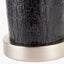 This stylish leather table lamp is hand-finished in India and creates a bold statement with its melange of black croc texture buffalo leather and silver metal detailing on the base of the lamp. Topped with a contrasting open weave white cotton lamp shade, providing a streamlined, monochromatic look.