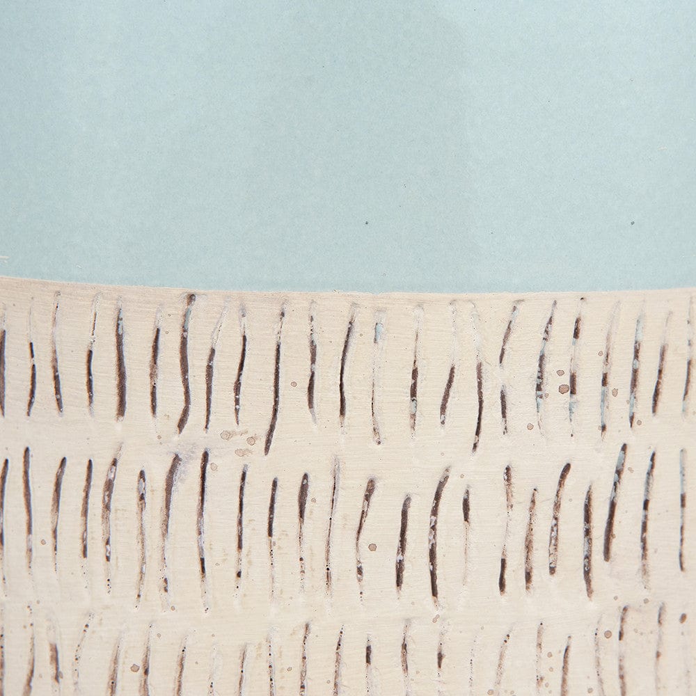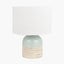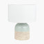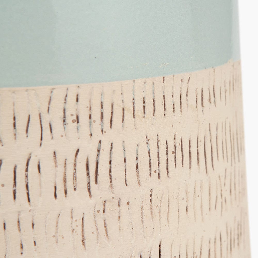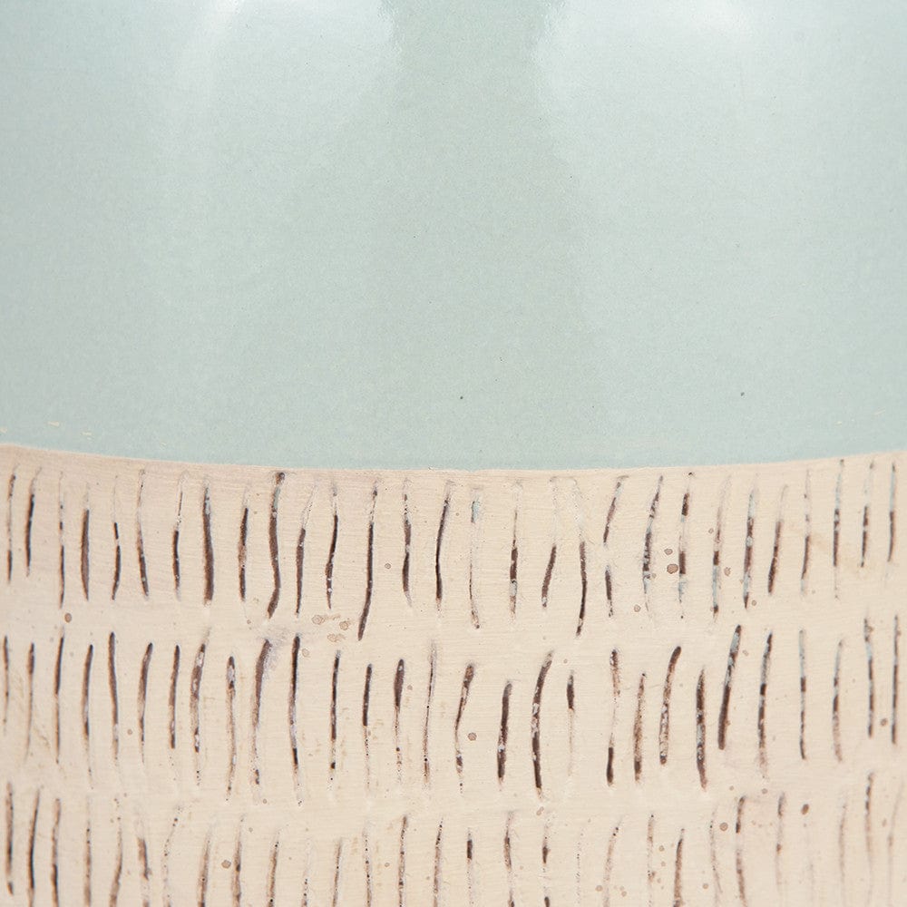 The scandi-inspired stoneware table lamp combines a hand applied textured natural finish juxtaposed with a sleek duck egg colour glaze. Made in the Phillippines, this statement table lamp base will look fabulous paired with a black or natural cylinder lampshade for a fresh, effortless style. Recommended lampshade size: 40cm diameter.