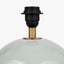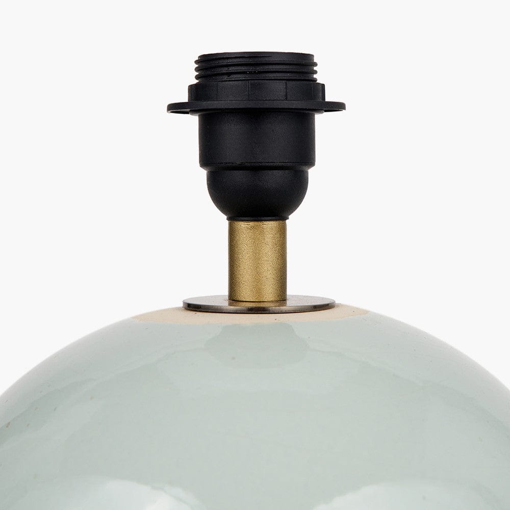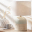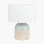 The scandi-inspired stoneware table lamp combines a hand applied textured natural finish juxtaposed with a sleek duck egg colour glaze. Made in the Phillippines, this statement table lamp base is finished perfectly with a modern white cylinder linen lamp shade that is self-lined, and the open weave material allows the light to filter through beautifully.