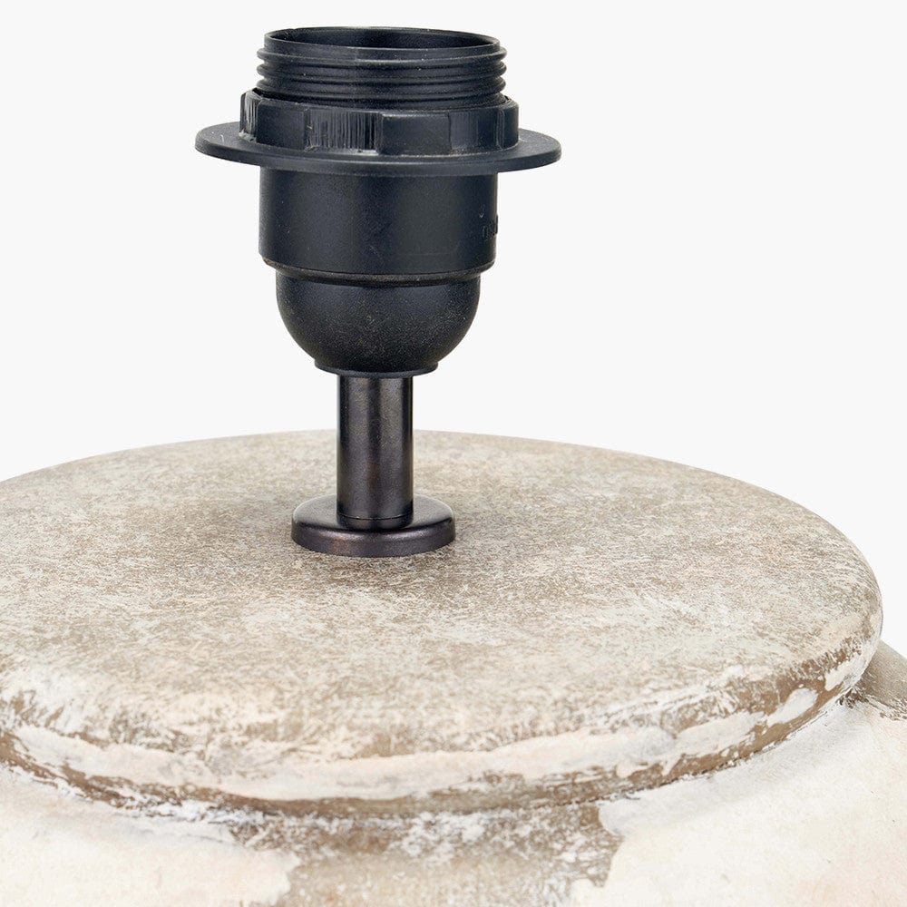 Individually handcrafted in the Philippines, our tall, urn shaped stoneware table lamp base, boasts an antique finish that adds depth to any room. Each piece features an abstract vintage design, making it one of a kind. With its neutral cream and grey tones, and timeless empire shade, in a natural slubby cotton, this lamp seamlessly fits into any interior, making it a versatile and stylish addition to your home.